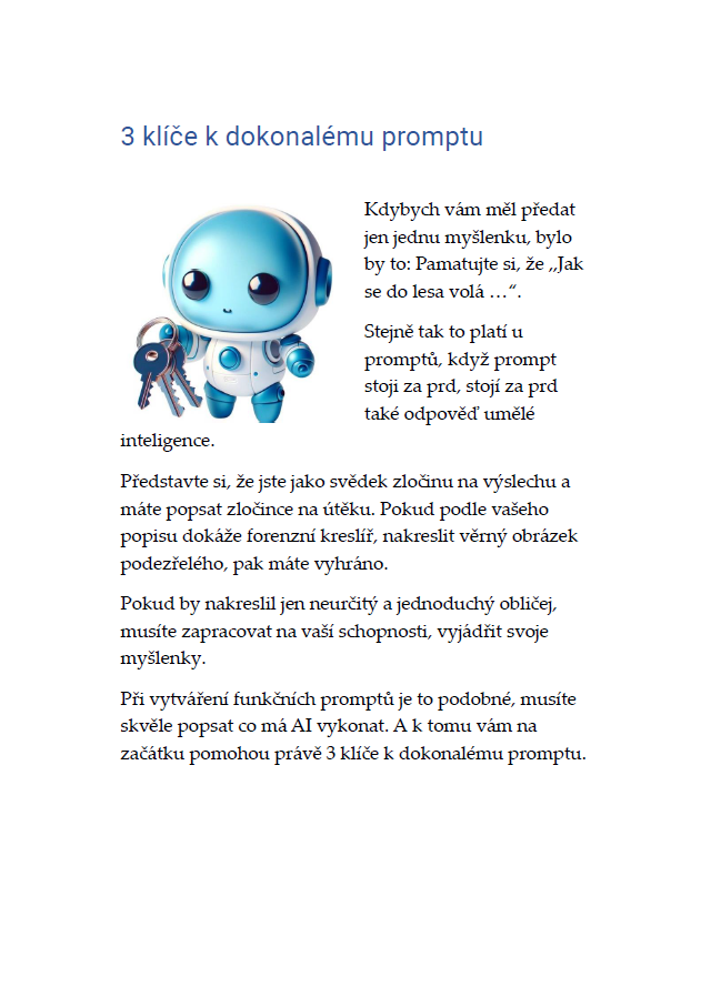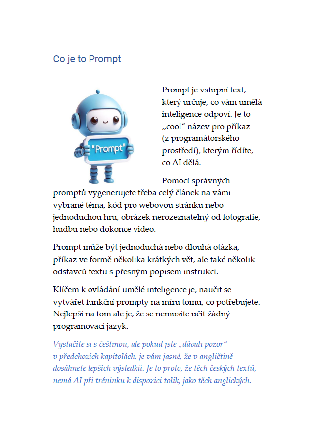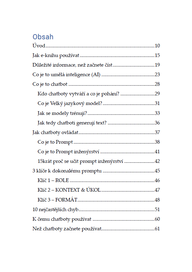 V této interaktivní e-knize vám ukážu, jak můžete využít umělou inteligenci v podnikání, v práci i v běžném životě. Naučíte se vytvářet efektivní příkazy pro AI (tzv. prompty) a získáte pomocníky se super schopnostmi. Budete výkonnější a efektivnější v práci i v podnikání, snáze rozjedete byznys pokud začínáte, rychleji se naučíte a pochopíte cokoliv a už nikdy nebudete zírat na prázdnou stránku ať už tvoříte cokoliv.