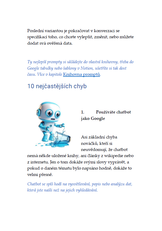 Koupí e-knihy získáte doživotní nárok na aktualizovaná vydání v elektronické podobě. Nemusíte si to hlídat, na email z vaší objednávky vám zašlu informaci o novém vydání a odkaz k jeho stažení. Stejně tak to platí pro nové prompty v Knihovně 600+ promptů.